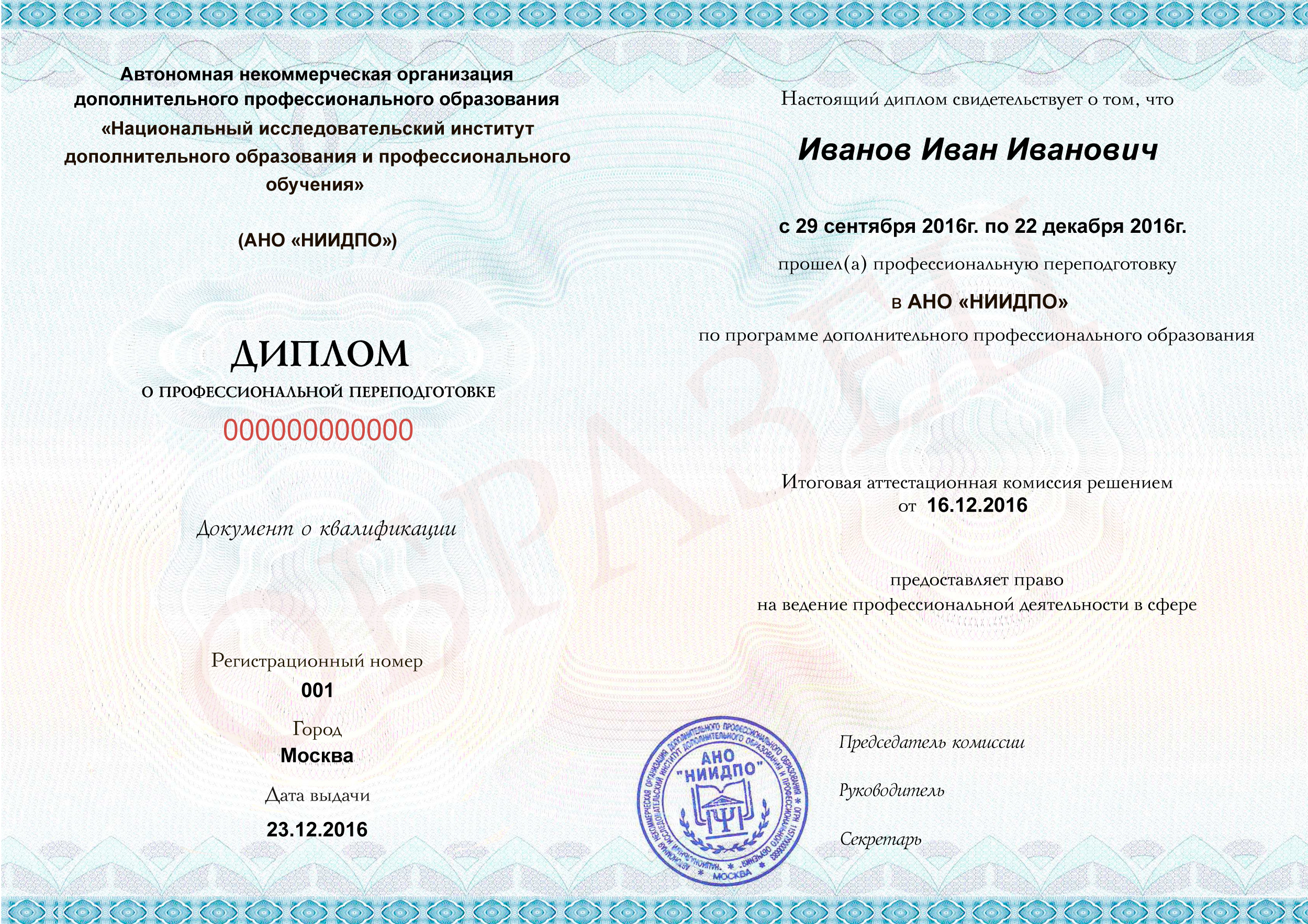 государственного образца о среднем профессиональном образовании (СПО);  | установленного образца о профпереподготовке  |